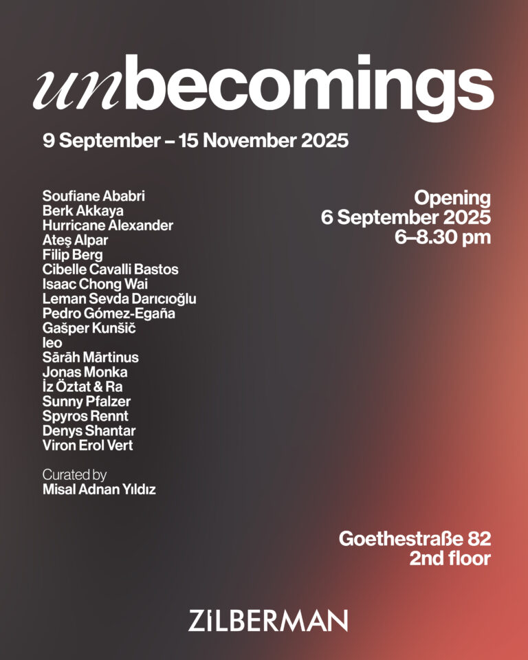 Ateş Alpar is featured in the group exhibition unbecomings at Zilberman Berlin, on view from September 9 – November 15, 2025. Curated by Misal Adnan Yıldız, the international exhibition brings together works by artists from diverse geographies. Alpar participates with the two-channel video installation Ilık Temas, contributing to the exhibition’s exploration of contemporary artistic dialogues across borders.